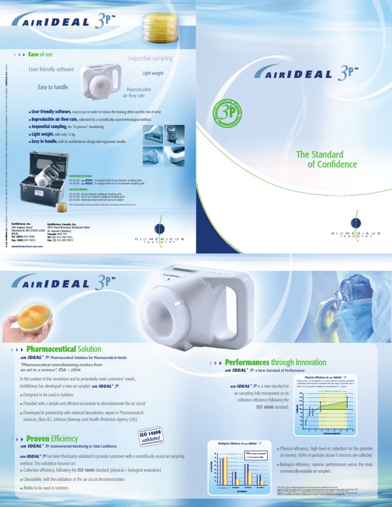 Standard air sampler This study confirmed that air IDEAL 3Phas a high level of collection of the particles of interest (above 5 µm) For these significant particle sizes, air IDEAL 3P was shown to have an efficiency of collection, superior to 100% set by the reference airCủa BioMériux (Pháp) với hiệu quả thu nhận mẫu trong không khí3P Environmental Monitoring in Total Confidence air IDEAL®